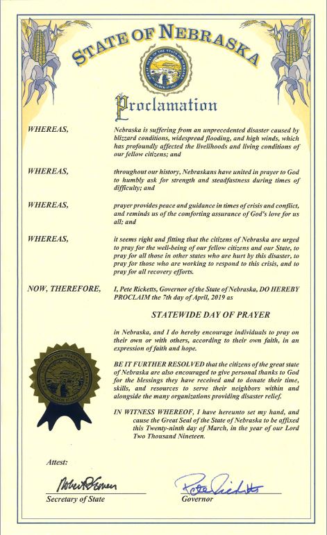 I appreciate @GovRicketts proclaiming Sunday, April 7th a Statewide Day of Prayer to lift up our fellow Nebraskans who are struggling to overcome the worst national disaster in our state's history.pic.twitter.com/Tf1Gr312cc