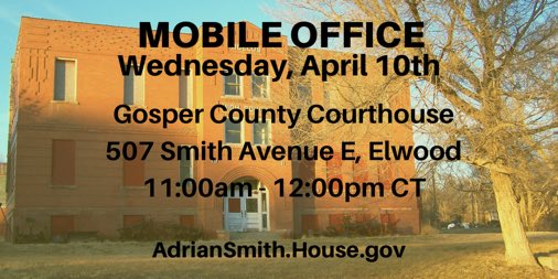 My staff will be at the Gosper County Courthouse today at 11:00am CT. Stop by to get help with a federal agency or share your thoughts on federal issues. #NE03pic.twitter.com/CKz5o24EKU