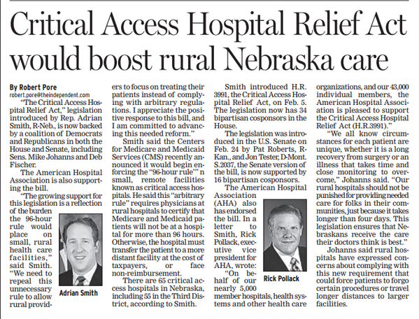 "Critical Access Hospital Relief Act would boost rural Nebraska care" in @theindependent #NE03 #RuralHealthpic.twitter.com/aKr0W8Iyjr