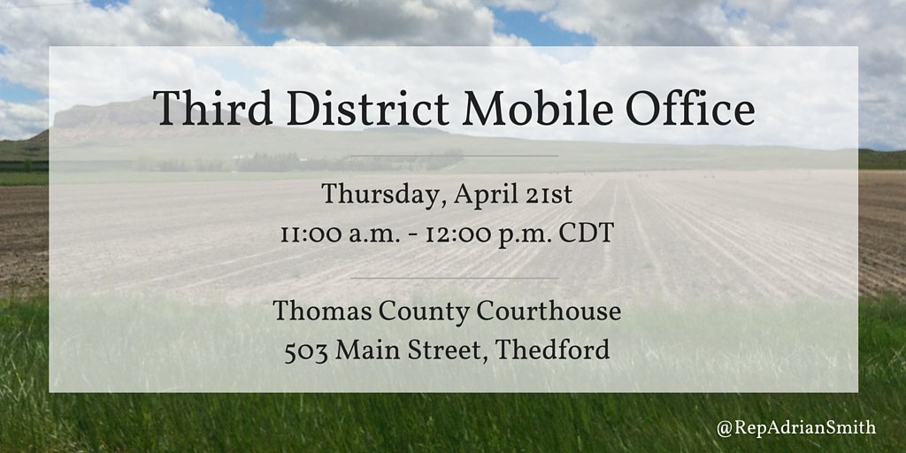 Today's #NE03 mobile office starts at 11 am in Thedford. Stop by to meet w/ my staff and ask questions.pic.twitter.com/eXP6r1IC9N