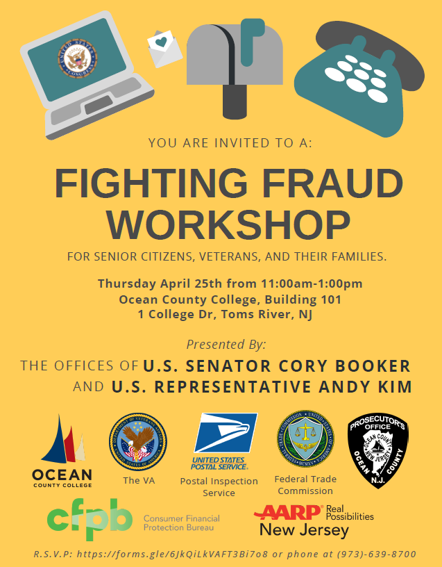 Join AARP NJ and the offices of Senator @CoryBooker and Representative @AndyKimNJ for a Fighting Fraud Workshop for Seniors Citizens, Veterans and their families. RSVP at http://spr.ly/6014EePmO  or call 973-639-8700 pic.twitter.com/w60iYeJVSc