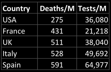 Of course Rep Levin, picks out the worst comparison countries to the US. Here is the US compared to our European allies. US has a lower death rate/M than the others. Spain, with the highest Testing rate, also has highest death rate. BTW, walk into any Walgreen if you need a test.pic.twitter.com/Am7tj3rCYJ