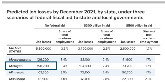 With no new funding for state and local governments, the HEALS Act is prescribing 5.3 million lost jobs as a remedy for the COVID-19 pandemic. 150,000 of those would be in Michigan. Thank you @EconomicPolicy for the analysis. #HealsActpic.twitter.com/dfSz53iWH7