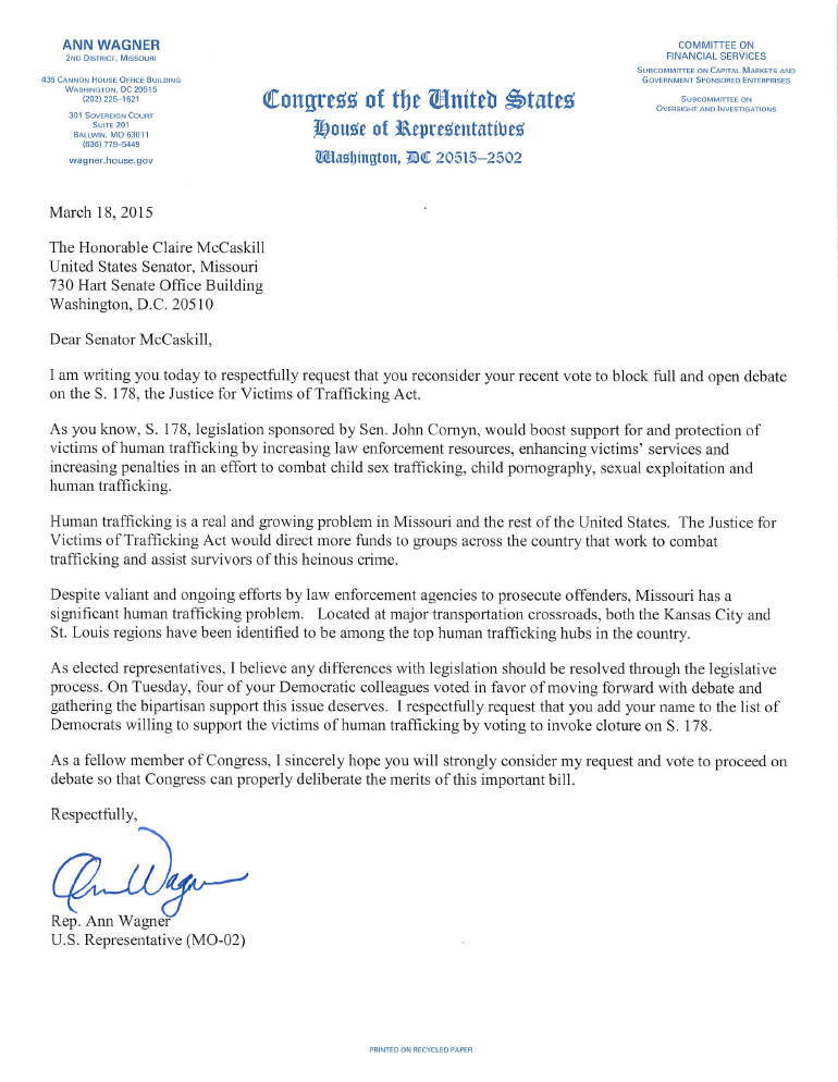 This afternoon I requested Sen. McCaskill reconsider her vote on the Senate sex trafficking legislation. #NotForSalepic.twitter.com/0NnuUNQT3V