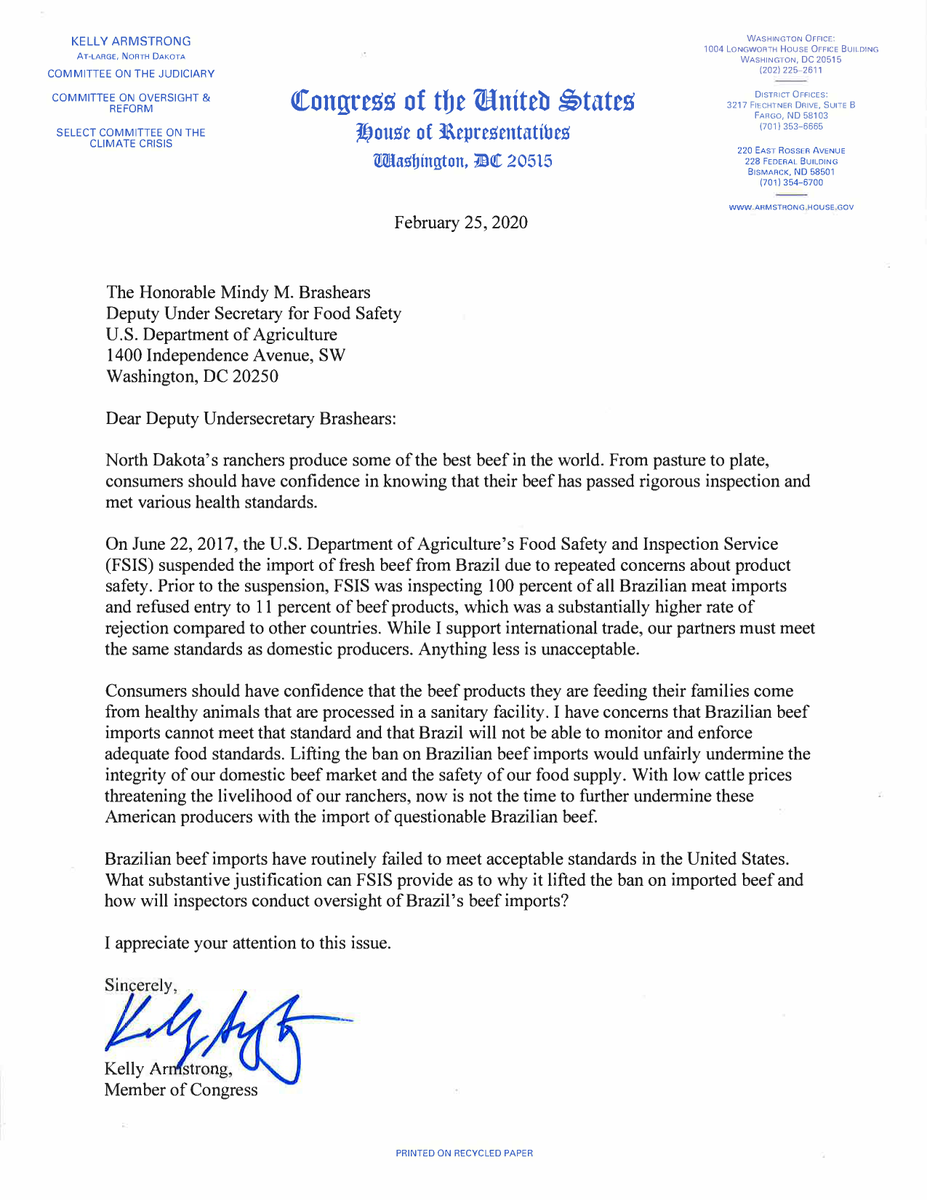 I have significant concerns with @USDA’s decision to lift the import ban on Brazilian beef. Consumers should have confidence that their beef has passed rigorous inspection, and I haven’t seen justification that Brazilian beef can meet that standard.https://armstrong.house.gov/media/press-releases/congressman-kelly-armstrong-pushes-usda-justification-lifting-brazilian-beef …