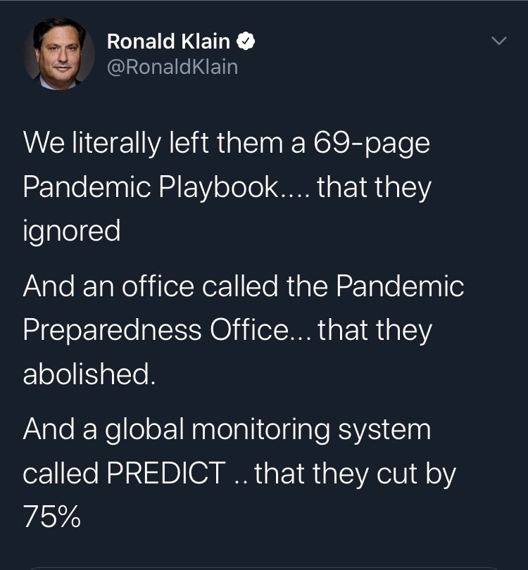 Former Ebola Czar: - Ronald Klain “We literally left them a 69-page Pandemic Playbook.... that they ignored. And an office called the Pandemic Preparedness Office... that they abolished. And a global monitoring system called PREDICT .. that they cut by 75%”pic.twitter.com/jN6JruEjhs