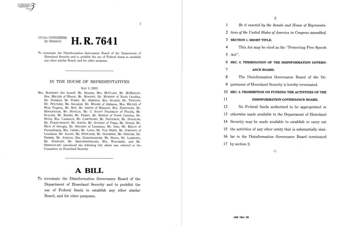 @RepBoebert's legislation to eliminate the creepy new DHS "Disinformation Governance Board" (DGB). I assume the DGB is going to be tasked with spreading disinformation.pic.twitter.com/jGHIoJ27PF