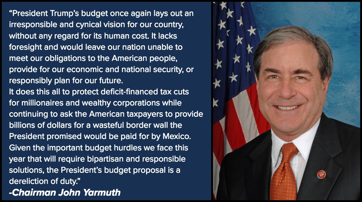 Chairman @RepJohnYarmuth: "President Trump’s budget once again lays out an irresponsible and cynical vision for our country, without any regard for its human cost." #TrumpBudget