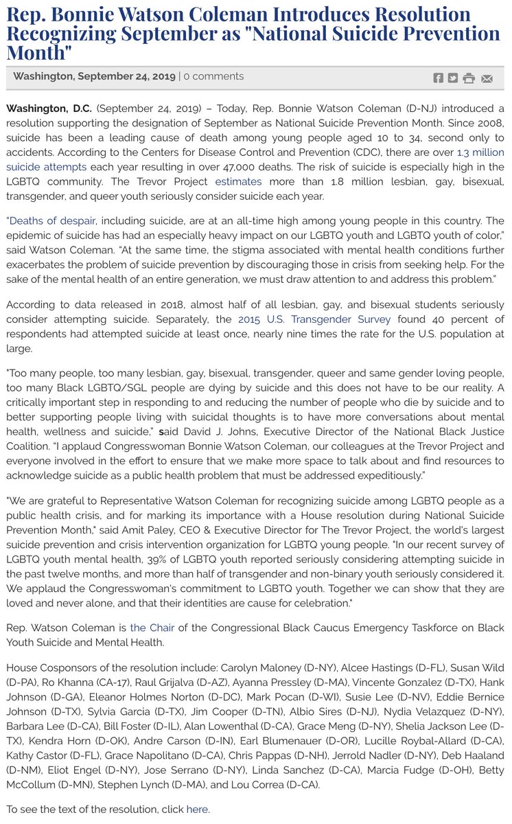 Today introduced a resolution with 37 of my colleagues to recognize September as "National Suicide Prevention Month." There are over 1.3M suicide attempts each year resulting in 47K deaths. https://watsoncoleman.house.gov/newsroom/documentsingle.aspx?DocumentID=1592 …pic.twitter.com/srjd4r8beT