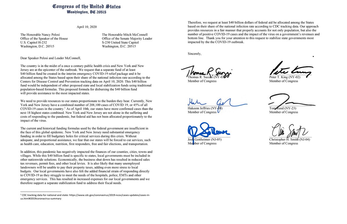 NJ & NY have over 50% of the country’s COVID-19 deaths, but only received 9% of federal aid to hospitals. The aid model isn't just irresponsible, it's deadly. I've joined the unanimous, bipartisan delegations from NJ & NY to call for $40 billion for our states to fight COVID-19.pic.twitter.com/co1Nelp79E