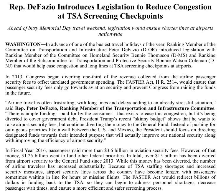 Rep Peter DeFazio, House Homeland Security Committee and TSA