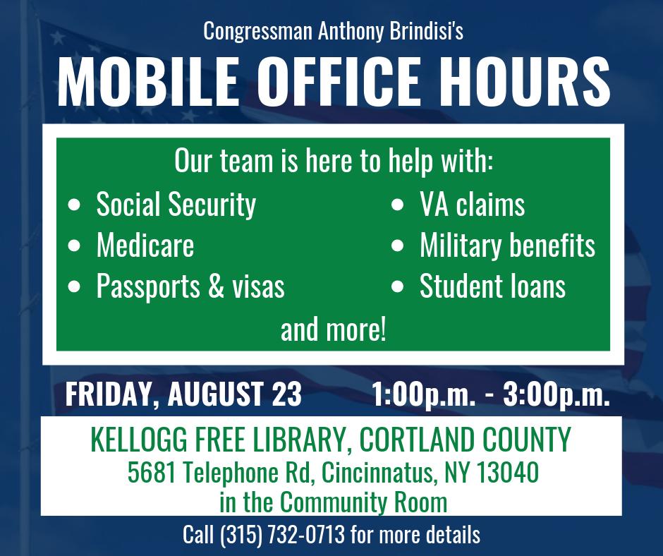 #TeamBrindisi will be at the Kellogg Free Library in Cincinnatus on Friday, August 23 to help solve your problems with the VA, Social Security, Medicare, and more. Can’t make it but need help? Call our office at (315) 732-0713.pic.twitter.com/Xmih46R4F9