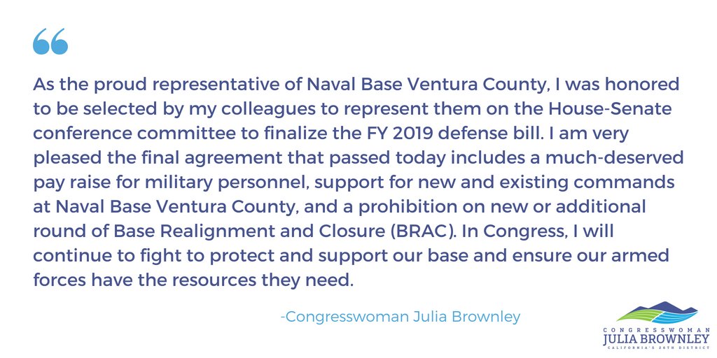 Today, the House passed the House-Senate conference agreement for #NDAA19. As the proud representative of Naval Base Ventura County, I was honored to be selected by my colleagues to represent them on the conference committee. My full statement here:pic.twitter.com/mp3ZjQ403n