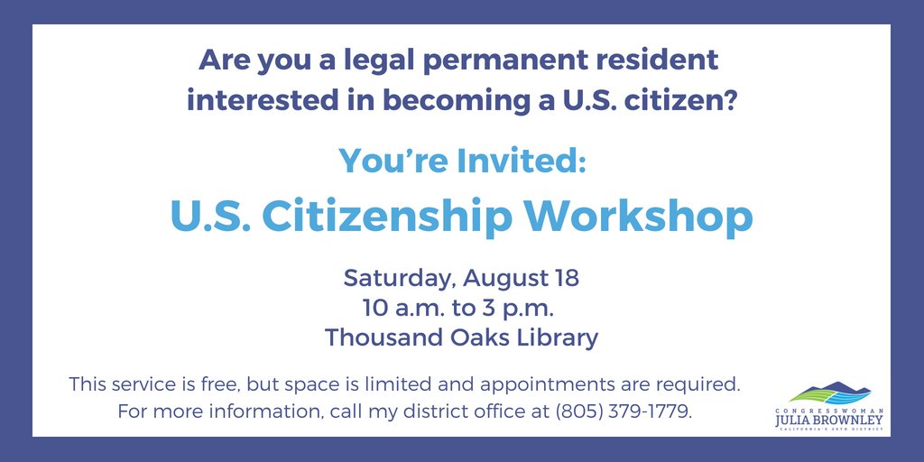 Are you a legal permanent resident interested in becoming a U.S. citizen? My office is hosting a U.S. Citizenship Workshop on Saturday, August 18, in Thousand Oaks. For more information or to schedule an appointment, please call (805) 379-1779.pic.twitter.com/JJkYXttjoQ