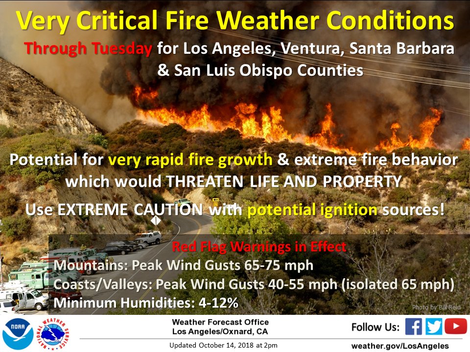 .@NWS has issued a Red Flag Warning for our area, due to strong winds that bring the potential for wildfires. I urge everyone to keep themselves up to date, listen to warnings from authorities & have a wildfire action plan in place to protect yourself, your family & your home.https://twitter.com/NWSLosAngeles/status/1051704528955998208 …