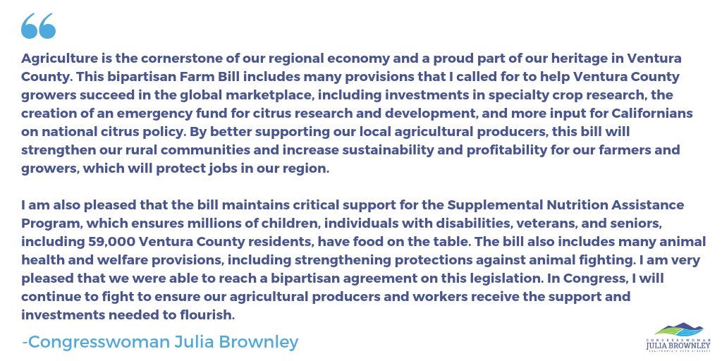 Agriculture is the cornerstone of our regional economy and a proud part of our heritage in Ventura County. This bipartisan Farm Bill includes many provisions that I called for to help Ventura County growers succeed in the global marketplace. Full statement
