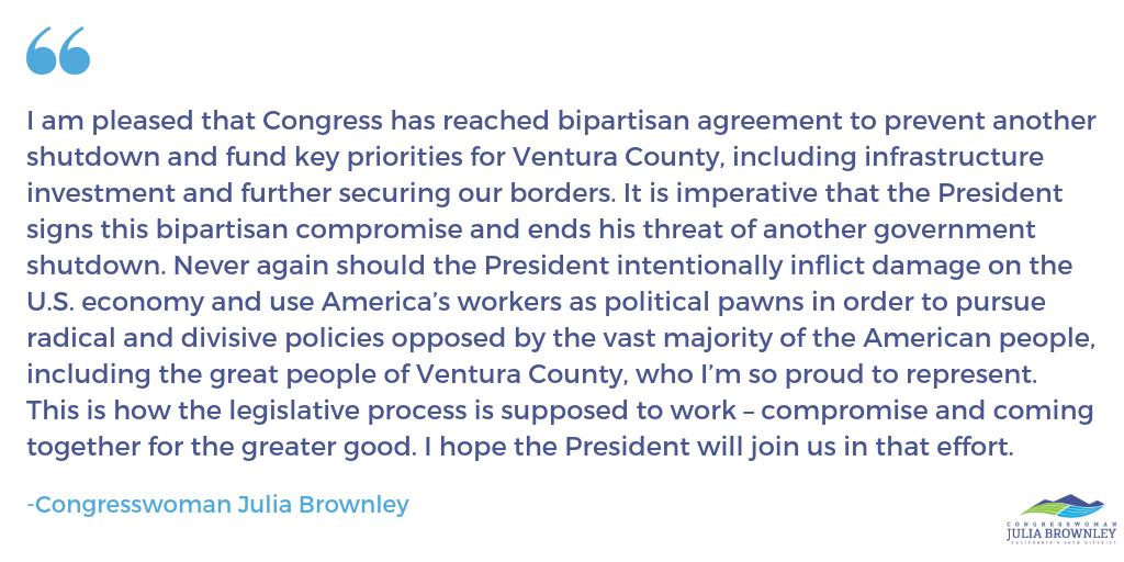 I am pleased that Congress has reached bipartisan agreement to prevent another shutdown and fund key priorities for Ventura County, including infrastructure investment and further securing our borders. My full statement ⬇️pic.twitter.com/8BXVYCZccc
