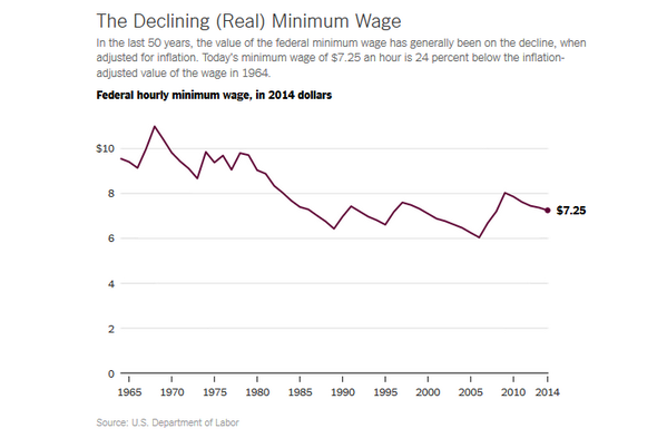 In the last 50 years, the actual value of the minimum wage has been on the decline. #raisethewagepic.twitter.com/nGBUb5V4SU