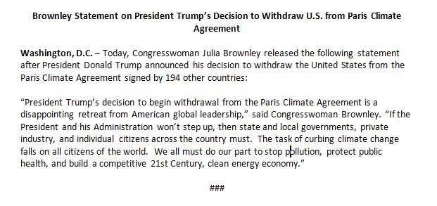 I live in your district and I support Donald Trump pulling out of the Paris climate agreement
