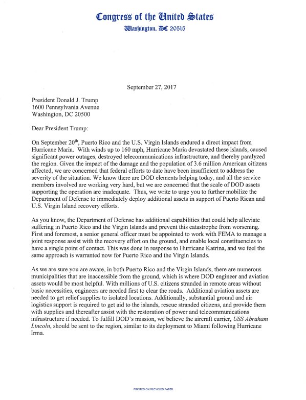 Delays in aid to PR & VI are unacceptable! My colleagues & I have urged @realDonaldTrump to expedite disaster assistance.pic.twitter.com/bpN0iDTabJ