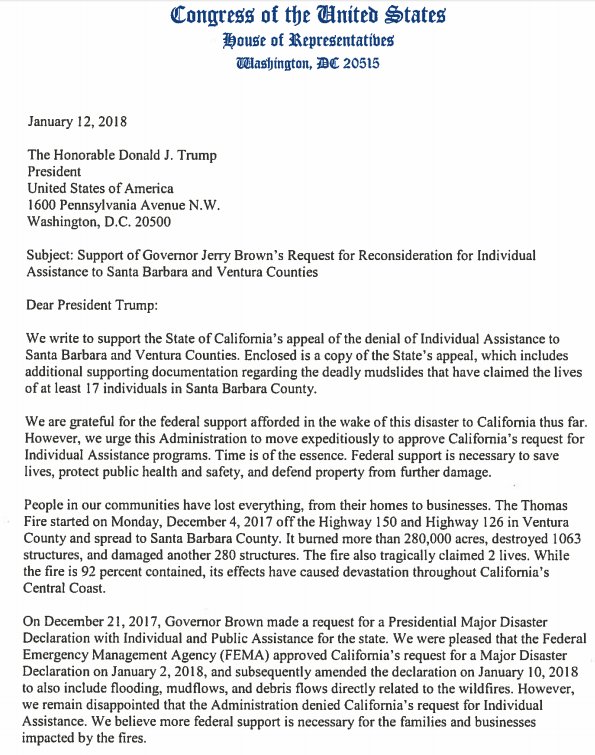 Today, I sent a letter with @RepCarbajal to @POTUS to urge him to reconsider his earlier decision to deny victims of the #ThomasFire access to FEMA’s Individual Assistance programs. These programs would provide much-needed aid for families & businesses who are working to recover.pic.twitter.com/KcELLgYrWB