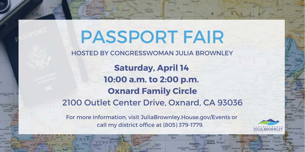 It's important to keep your passport up to date! I am hosting a Passport Fair on Saturday, April 14th in Oxnard, where staff from the LA Passport Agency will be on hand to renew old passports and process first-time applications. More details available at http://JuliaBrownley.House.gov/Events .pic.twitter.com/VOuoAx9x1Z