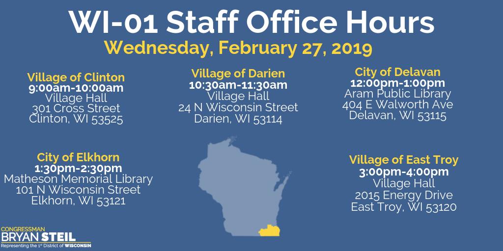 Today we have 5 staff office hours throughout #WI01. Stop by if you need help with a federal agency or want to share an opinion!pic.twitter.com/NkqPzYJ4sh