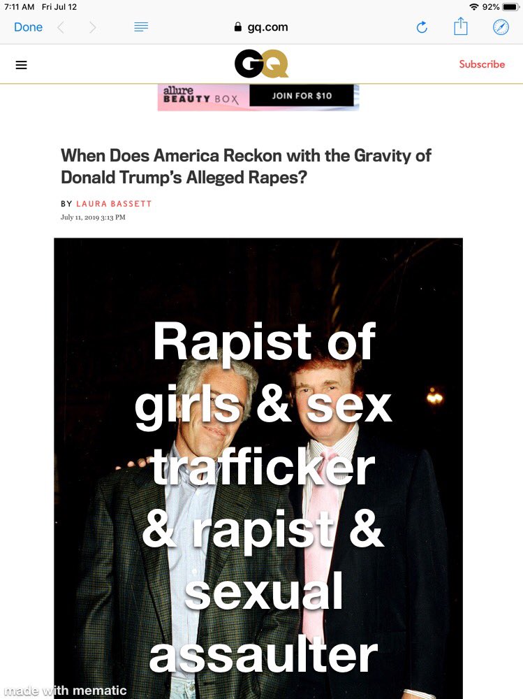 Now that Epstein pled the fifth when asked if he & Trump socialized with minors,do a thorough investigation into his ties with Trump. Investigate the human trafficking, the rapes & the financial contacts with foreign countries. We voted you to represent ALL Americans, not Trump.