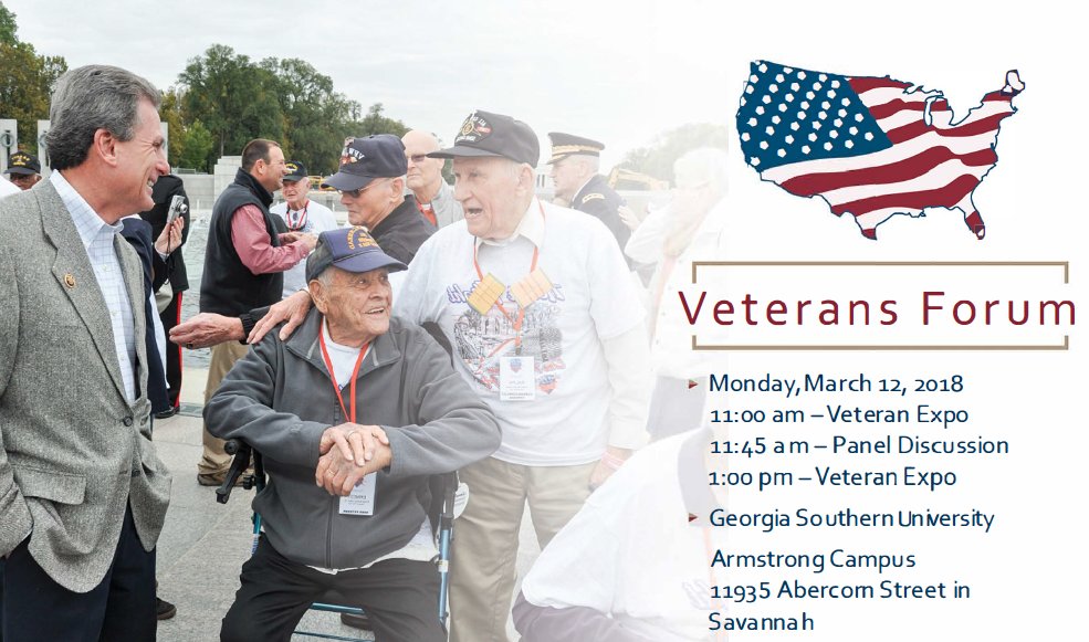 Reminder! I am hosting my 4th annual Veterans Forum on Monday, March 12. The forum will bring together experts from veterans services organizations, officials from the VA, and veterans from across GA-1 to discuss important issues impacting veterans and to offer assistance.pic.twitter.com/atkExFV9A0