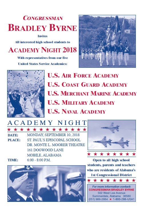 Are you or someone you know interested in attending one of our nation's military service academies? If so, please come out to my 2018 Academy Night on Monday, September 10th at @StPaulsMobile. #alpoliticspic.twitter.com/qCZrzMG9RC
