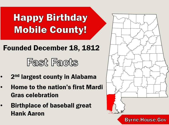 Wishing a happy birthday to Mobile County! Home to Alabama's only seaport and the birthplace of Mardi Gras, Mobile County was founded on this day in 1812. #ALpoliticspic.twitter.com/BWTwm1fXKs