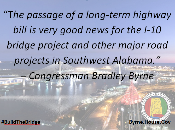 Today's passage of a long-term highway bill is good news for Southwest Alabama. More: https://byrne.house.gov/media-center/press-releases/house-transportation-bill-good-news-for-i-10-bridge-byrne-says …pic.twitter.com/ce9Z4c1bWD