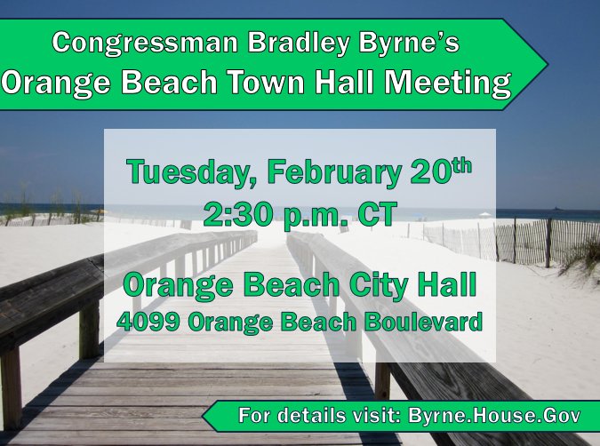 Excited to announce that I will be holding three town hall meetings next week in #BayMinette, #Chickasaw, and #OrangeBeach. #ALpoliticspic.twitter.com/ssqu8wnHbI