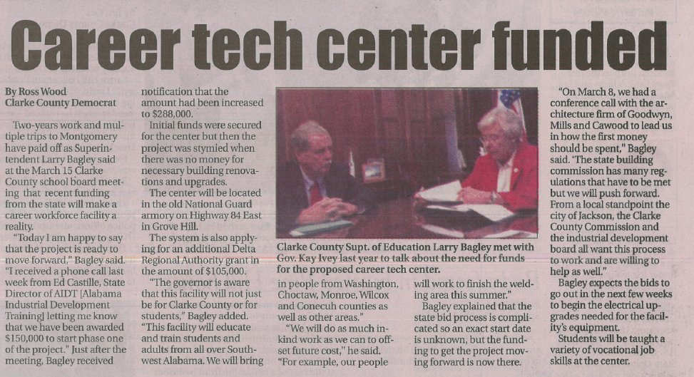 BIG NEWS for Clarke County and workforce development in Southwest Alabama. The new career technical education center project in Grove Hill will move forward, creating important training opportunities for people in Clarke, Monroe, and Washington counties.pic.twitter.com/ZUWFEqUxz4