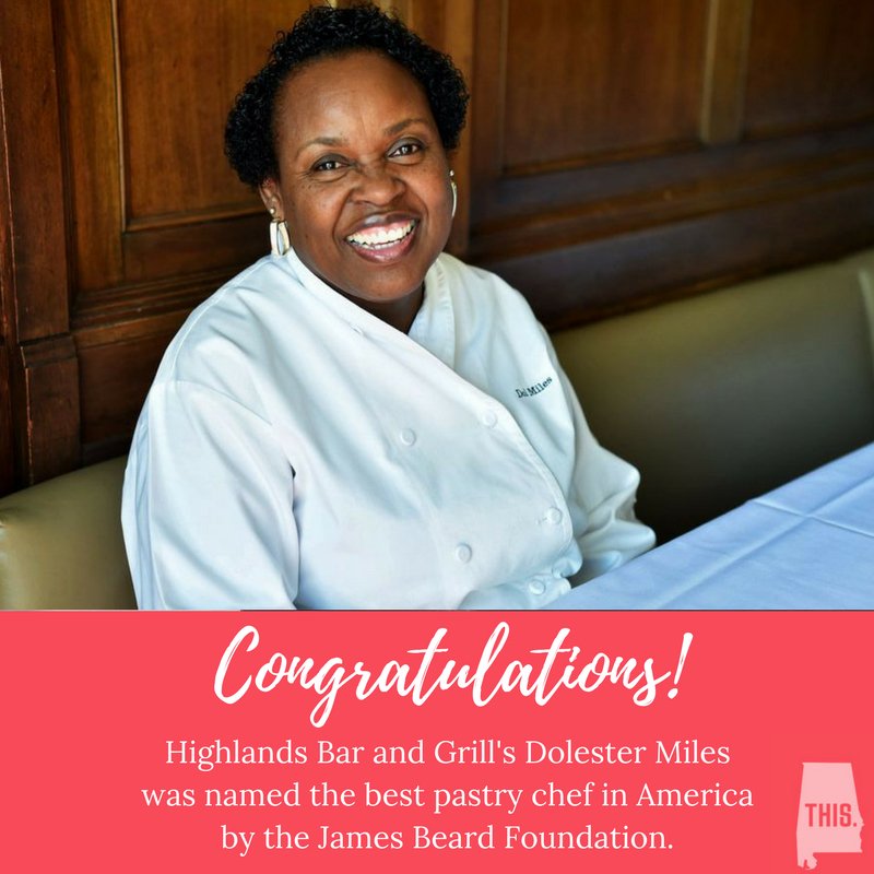 Congratulations to Birmingham’s Dolester Miles on being named the nation’s top pastry chef!
