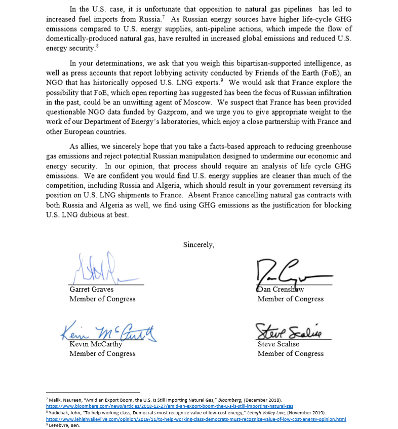 @RepGarretGraves,@RepDanCrenshaw,@GOPLeader,@SteveScalise, and others sent a letter to French President Macron asking him to reverse the French position on U.S. LNG in light of its much lower emissions than Russian gas and others exporting to France.pic.twitter.com/kiM3EB0RGW