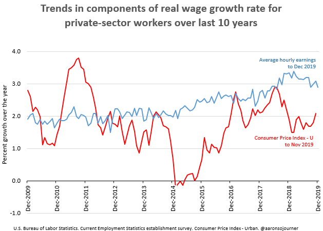 Average hour of work buys just 0.8% more now that a year ago. Wages up 2.9% over the year (blue, decelerating). Prices up 2.1% (red, accelerating). Real wage growth (blue-red) slower than a few months ago, slower than 2015, & slower than much of 2016.pic.twitter.com/Fw7lRCE65V