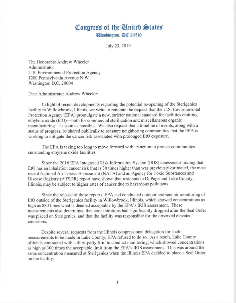 .@SenatorDurbin, @SenDuckworth, @RepBillFoster, @RepLipinski, @RepSchneider & I sent a letter to @EPA to set stricter standards for Ethylene Oxide after we heard about the potential reopening of Sterigenics. They must do their job & protect Illinoisians.http://bit.ly/2M5koPW