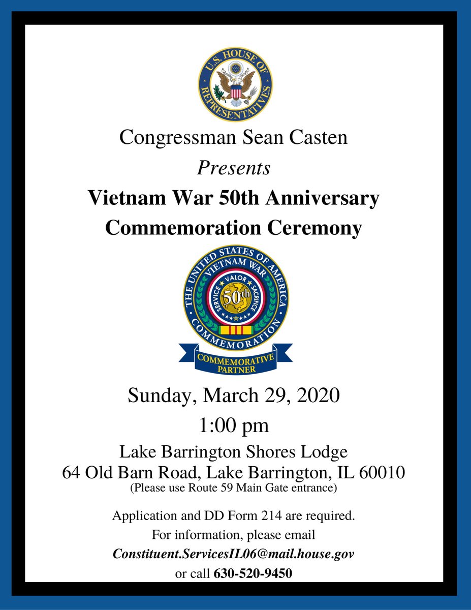 The Vietnam War 50th Commemoration was established by the 2008 National Defense Authorization Act. It recognizes Veterans who served on active duty in the U.S. Armed Forces at any time during the period of November 1, 1955 to May 15, 1975, regardless of location of service.