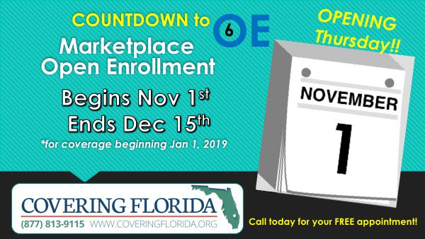 Need insurance coverage for 2019?... #OpenEnrollment starts in 3 more days, on November 1st, and the #ACA #Marketplace is only available for the next 6 weeks, until Dec. 15th in FL. Help us share the word with you friends, family & colleagues! #GetCovered #StayCovered #Sayfie pic.twitter.com/yaydeslvqx