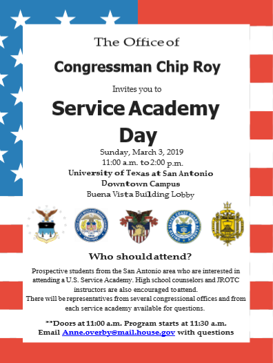 Please join me at the downtown campus of the @UTSA THIS SUNDAY (March 3) for the Service Academy Day! High school counselors and JROTC instructors are also welcome! https://roy.house.gov/service-academy-day …pic.twitter.com/lK1RqabiEv