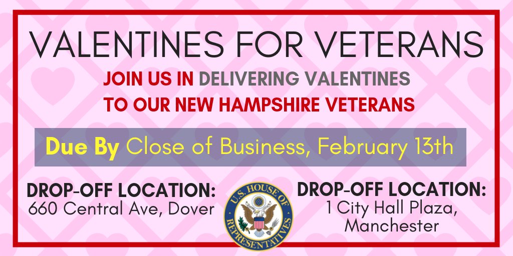 We're inviting everyone to join @MayorJoyceCraig & me by making Valentines Day cards to give to our veterans. You can drop off your valentines @ 1 City Hall Plaza in Manchester or 660 Central Ave in Dover before Feb 14th. We’ll be delivering them to the #MHT VA on Valentines Day.pic.twitter.com/GHrH8FLJaw
