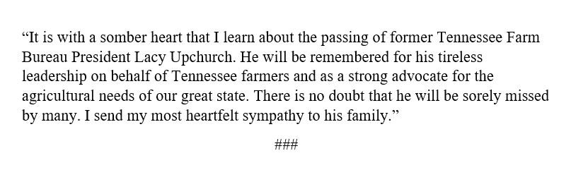 It is with a somber heart that I learn about the passing of former @TNFarmBureau President W. Lacy Upchurch.