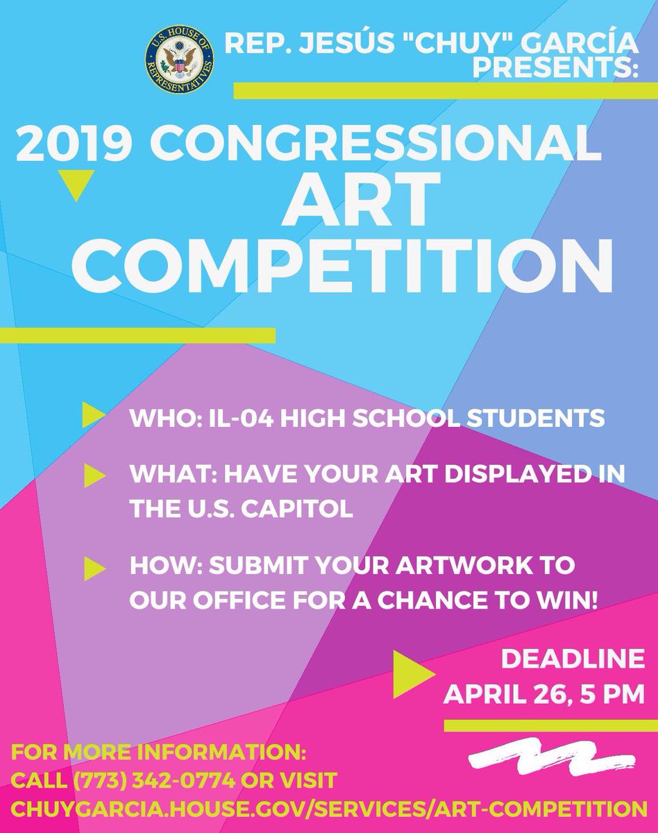 ¿Eres un estudiante que ama el arte? ¿Vives en el 4o. distrito? ¡Entonces esto es para ti! Invitamos a todos los estudiantes de high school del 4o. distrito congresional de Illinois a participar en el Concurso de Arte del Congreso del 2019. Para más información, ver la foto.pic.twitter.com/mn1rfuLAYF