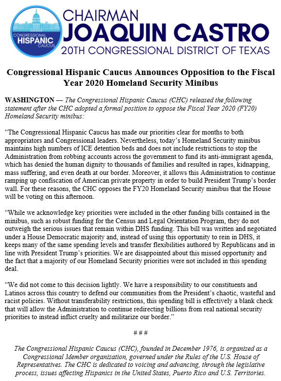 CHC opposes the FY20 DHS minibus. The bill does not rein in DHS, it funds Trump’s #BorderWall, maintains high levels of ICE detention beds, & does NOT restrict the Admin from robbing govt accounts for its anti-immigrant agenda. Read our statement opposing the minibus ⬇️ pic.twitter.com/U1YjCwa7HN