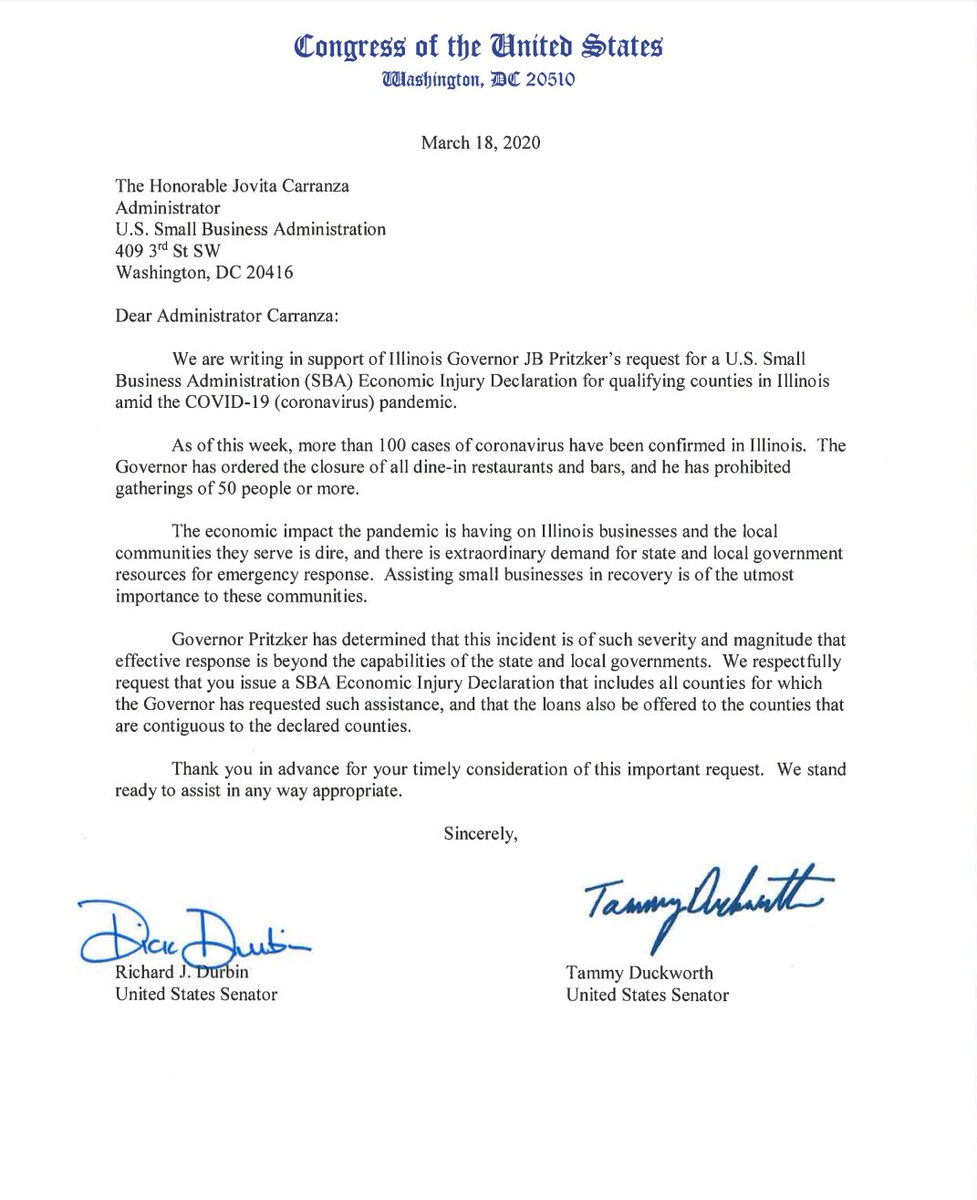 Small businesses are struggling to keep their doors open. The entire Illinois Delegation wrote to @SBAgov to urge them to issue an Economic Injury Declaration for Illinois to help small businesses in our state during the #COVIDー19 pandemic.https://twitter.com/SenatorDurbin/status/1240640393739468801 …