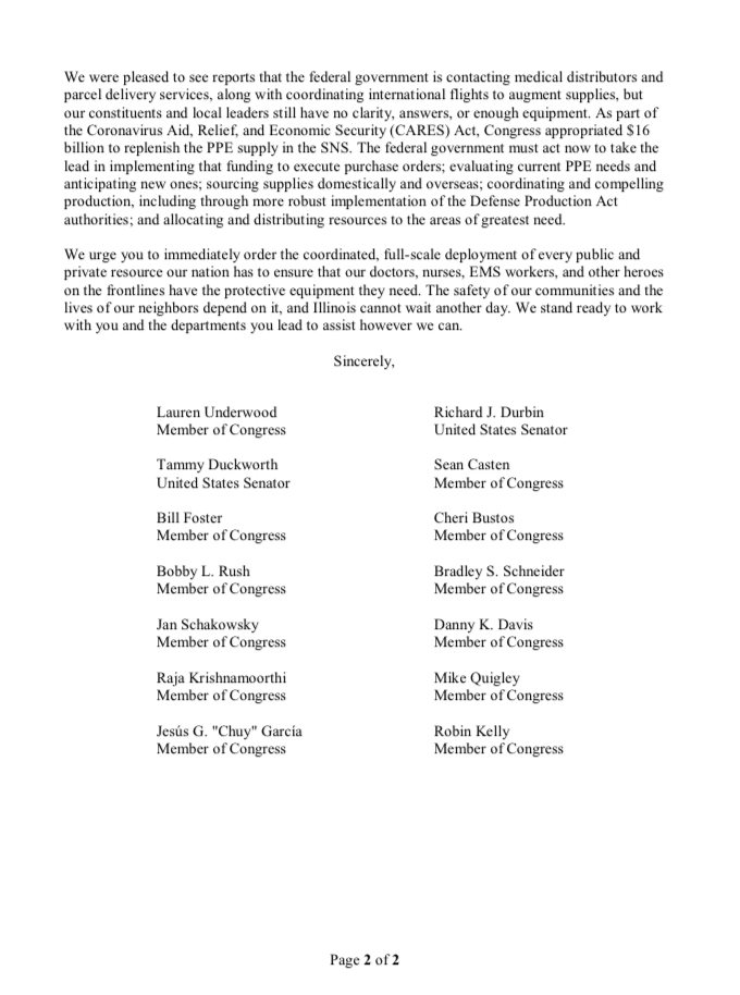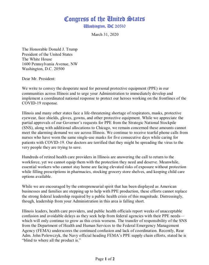 Our health care workers need proper protective gear. I joined @RepUnderwood and other Illinois delegation members urging the Administration to immediately implement a federally coordinated effort to meet Illinois’ need for personal protective equipment.https://twitter.com/RepUnderwood/status/1245065767911075845 …