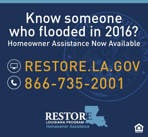.@RestoreLA_gov Homeowner Assistance Program is ready to help those affected by the 2016 floods. Take the 1st step, complete the survey -->pic.twitter.com/JcItOSt4EM