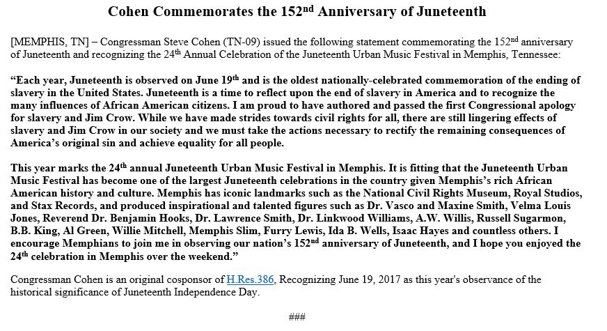 Today marks the 152nd Anniversary of #Juneteenth. Proud to have authored & passed the first Congressional apology for #slavery & #JimCrow.pic.twitter.com/qog6q8B1T7