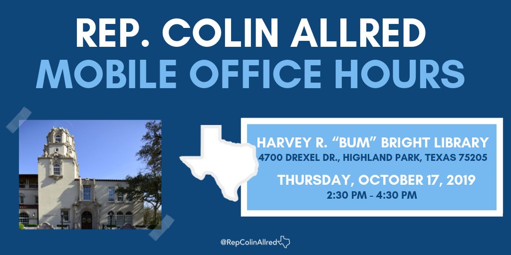 This Thurs., my office is hosting mobile office hours in Highland Park! Stop by the Harvey R. “Bum” Bright Library from 2:30 PM - 4:30 PM to learn how we can assist w/ federal agencies or answer questions you may have about constituent services. RSVP here: https://www.eventbrite.com/e/75699076977 pic.twitter.com/v9idJR8t9z